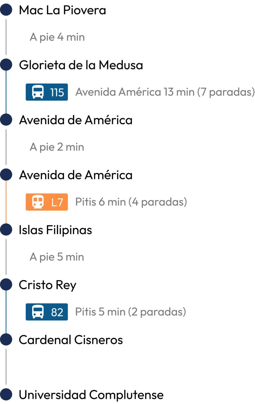 En MAC La Piovera te alojas en un barrio residencial bien comunicado, a 10 minutos del metro y con autobuses a la puerta. Todas las habitaciones cuentan con baño privado, Wi-Fi y zonas de estudio. Incluimos comidas de lunes a viernes, lavandería gratuita, limpieza y seguridad 24/7. Y además, tienes acceso al Centro Deportivo AQA a 7 minutos andando.