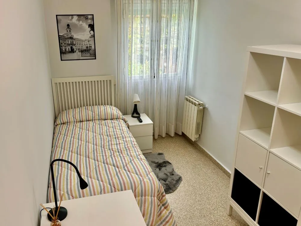 El espacio cuenta con una cama individual equipada con sábanas, edredón y almohadas mullidas, colocada estratégicamente para aprovechar la luz natural que entra por los amplios ventanales. A un lado, un escritorio con lámpara de estudio, estantería y silla ergonómica proporciona el entorno ideal para el estudio o el teletrabajo.