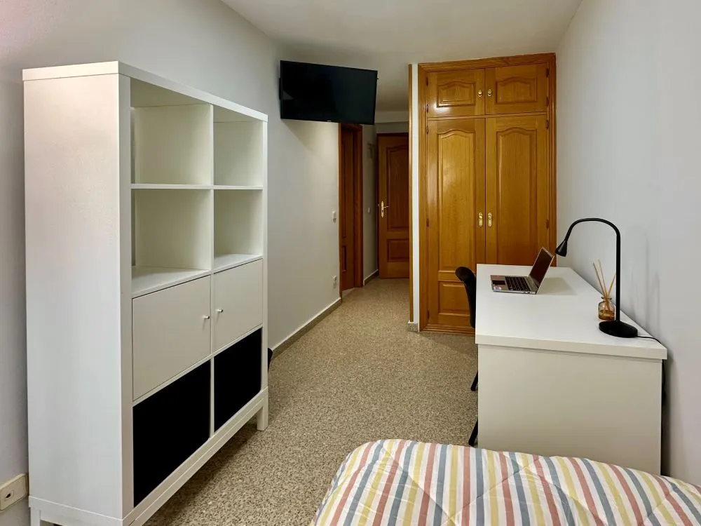El mobiliario se completa con un armario de gran capacidad y una cómoda auxiliar, ofreciendo espacio suficiente para mantener la habitación ordenada. El baño privado, moderno y práctico, incluye ducha, lavabo y un diseño funcional que garantiza comodidad en el día a día.