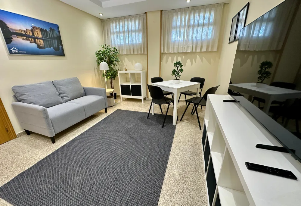 Al entrar en esta amplia suite doble, La primera estancia está decorada con un estilo moderno y acogedor, donde un cómodo sofá se encuentra frente a una televisión de 55 pulgadas Smart TV, perfecta para disfrutar de tus programas o aplicaciones favoritas. A un lado, una mesa de comedor rodeada por cuatro sillas invita a compartir momentos agradables con juegos de mesa.