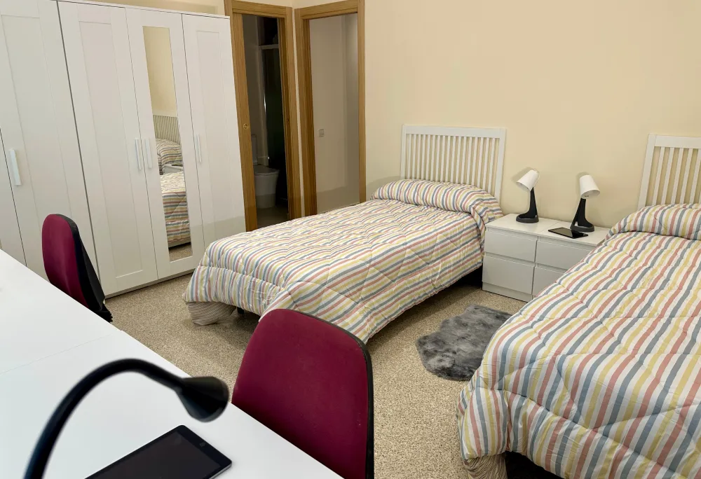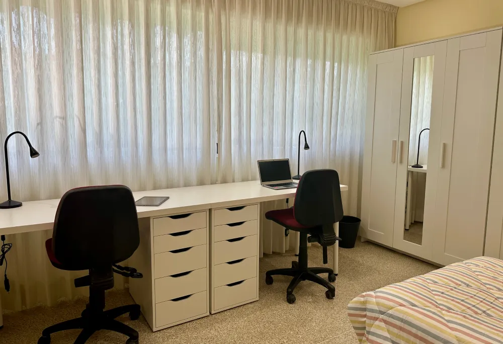 En la segunda estancia la luz natural inunda el espacio gracias a sus enormes ventanales que ofrecen una vista panorámica al jardín. Es el refugio ideal para el descanso, con dos cómodas camas individuales, cada una con sábanas y edredón y almohadas mullidas. Justo al lado, dos escritorios colocados en posiciones estratégicas permiten trabajar sin distracciones, brindando el ambiente perfecto para la concentración.