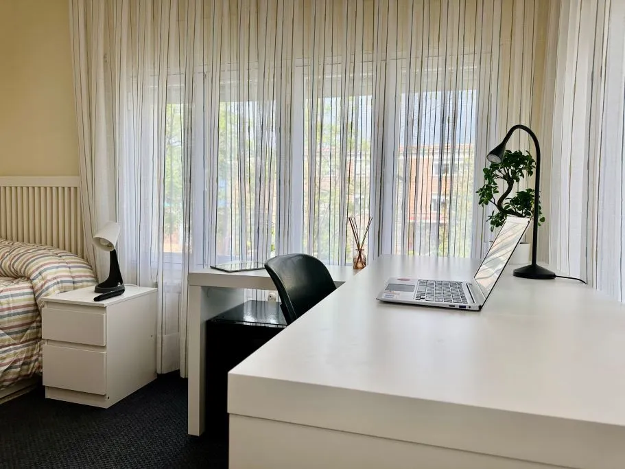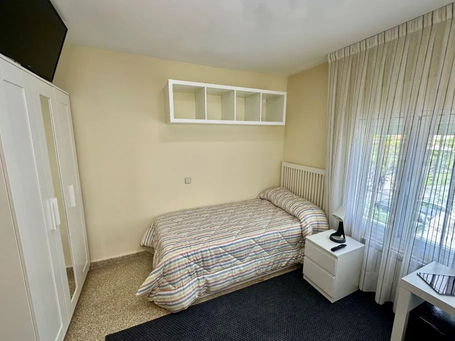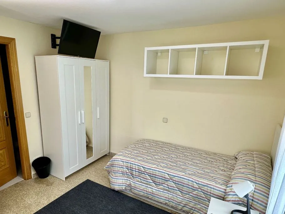 El área de estudio cuenta con un doble escritorio amplio en esquina, estantería y silla ergonómica, todo dispuesto para favorecer la concentración y la productividad. Además, la habitación dispone de un armario espacioso y otros elementos de almacenaje que ayudan a mantener el orden con facilidad.